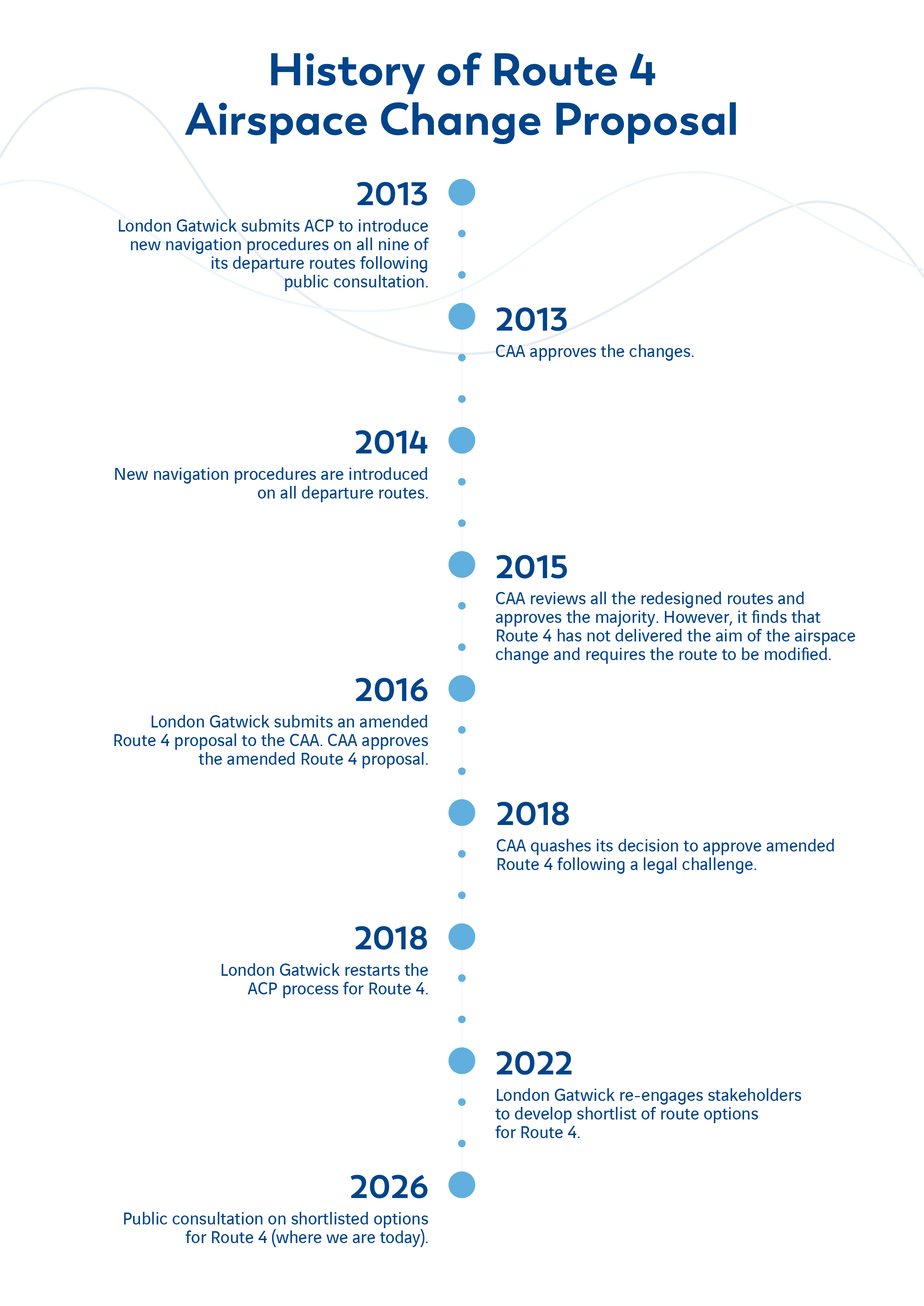 Satellite-based navigational procedures were first introduced on all nine departure routes from the Main Runway at London Gatwick in 2013, including Route 4, following an ACP process and extensive community engagement. However, due to regulatory and legal challenges, this technology was subsequently withdrawn on Route 4 in 2019.