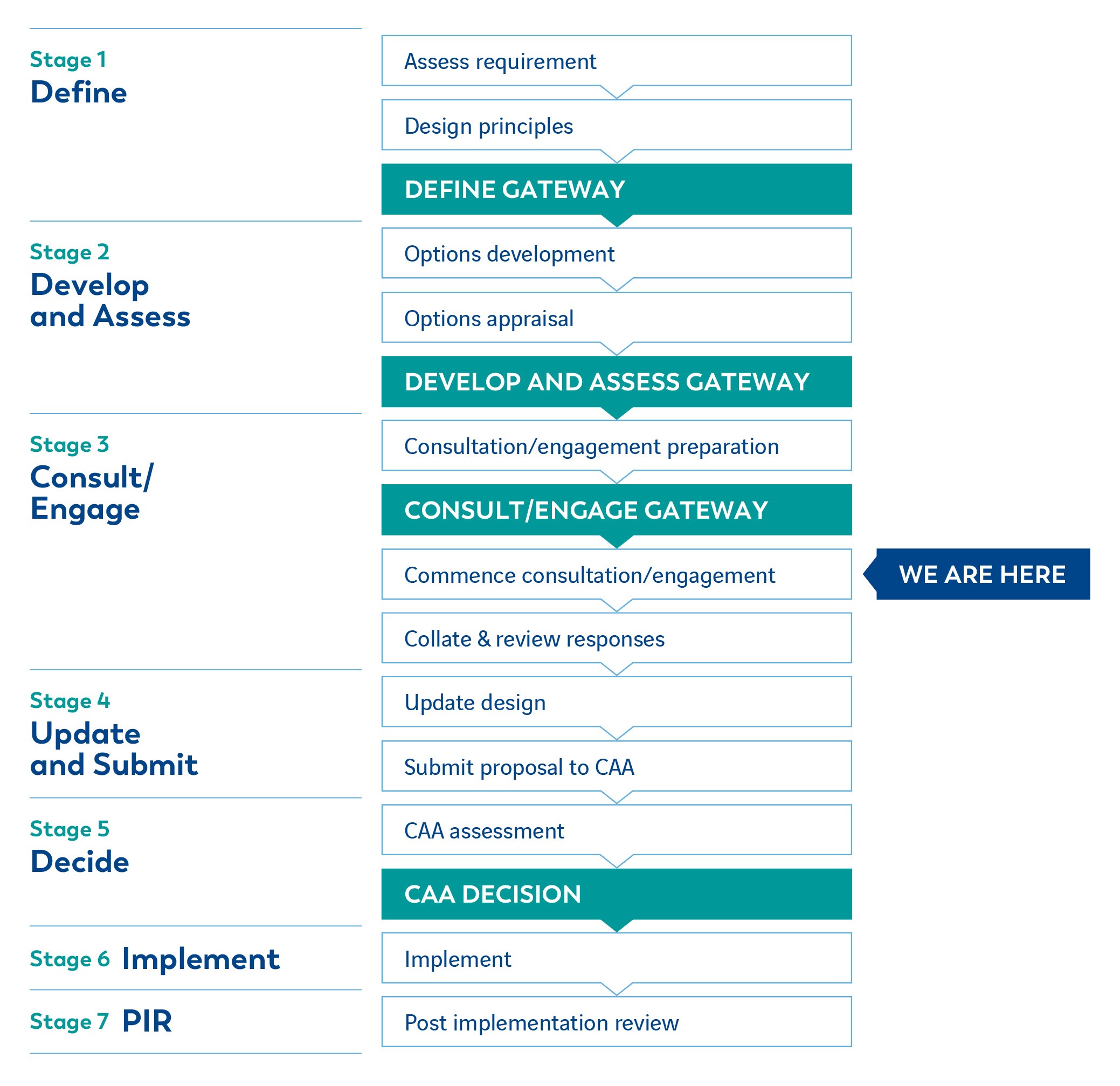 At Stage 6, the approved final ACP will be implemented. At Stage 7, the Post Implementation Review will analyse the impact of the implemented airspace change to allow the CAA to determine if it has produced the intended outcomes.